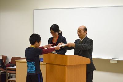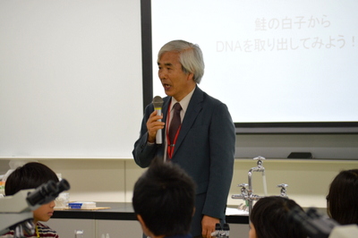 この日は、6月から実施されてきた子ども大学の最終日。午前は、齋藤博先生の指導により、自分の「頬」の細胞を顕微鏡で見たり、実習「サケの白子からDNAを取り出そう」に挑戦しました。2時間半の実習に真剣に取り組んでいました。午後は子ども大学で学んだ内容の発表会となり、子ども大学の多くの学生が「学校では学ぶことができない沢山のことを体験できた」と発表していました。多くの感動があったようです。最後に、67名の子ども大学の学生に、丁宗鐡子ども大学学長(日本薬科大学学長)から修了証が授与されました。