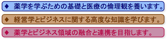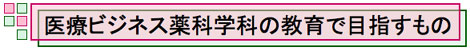 わが国は、サイエンスとビジネスの両方に精通できるような教育機会がなく、医療ビジネス分野の人材育成が立ち遅れています。学術界、産業界、そして医療界を総合的に理解できる人材の養成がまさに急務となっています。このように医療を取り巻く環境が大きく変化していることから、従来の薬学教育の枠組みにとらわれない新しい取り組みが必要とされています。医療ビジネス薬料学科では、薬学が得意とする医薬品の知識だけではなく、医療全般に関する基本的な知識・技能、 経営学等に関する広範な知識を融合させる教育を行います。