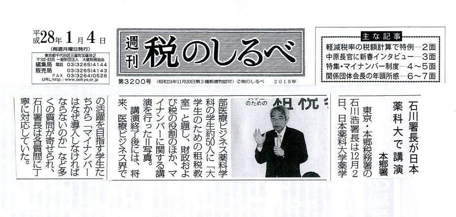 医療ビジネス薬科学科で開催された「租税教室」が『税のしるべ平成28年1月4日号』に掲載されました。