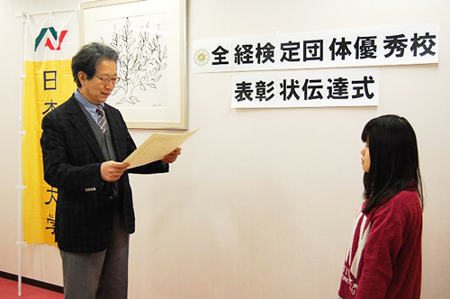 3月7日(月)にお茶の水キャンパスにおいて、全国経理教育協会団体優秀校の表彰状授与式が行われました。 本学科で文部科学省が後援する簿記能力検定を受験し、特に優秀な成績を収めた1年生(2級)と2年生(1級)2名が代表で表彰され、同協会の会長である麻生太郎元総理大臣からのメッセージが伝達されました。