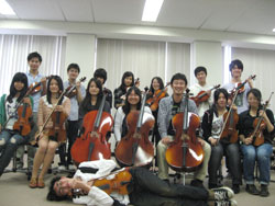 新入生の大半が弦楽器初心者です。バイオリン、ビオラ、チェロの貸し楽器を用意しています。皆で楽しく演奏しましょう♪ |