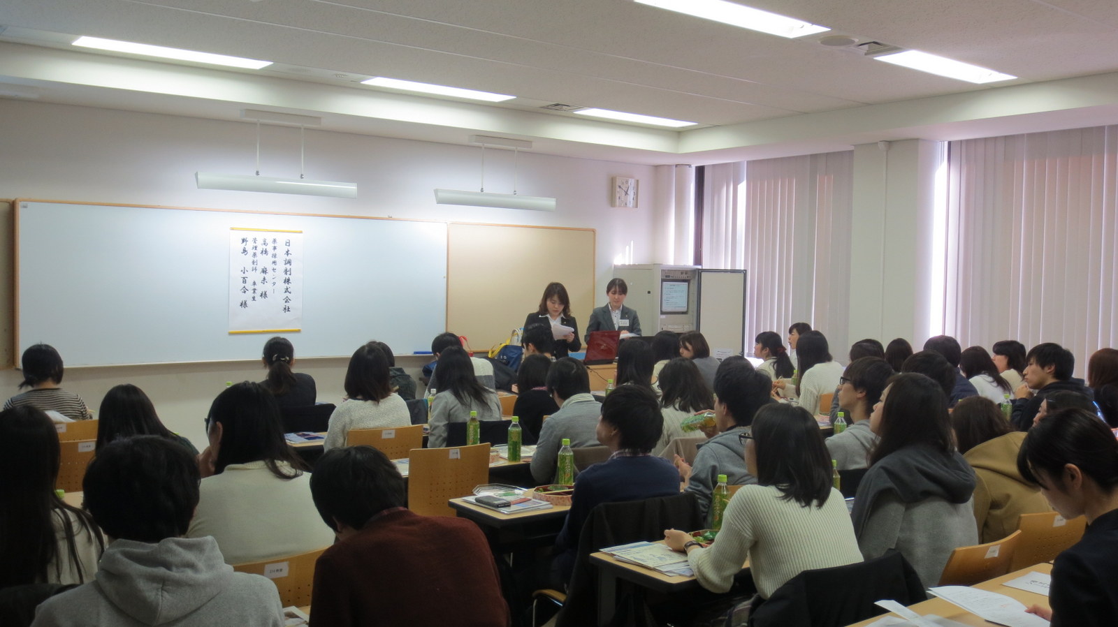 1月20日(水)第8回ランチョンセミナーを開催しました。北海道から沖縄まで525店舗を展開している日本調剤株式会社からは、薬事採用センター主任薬剤師の髙橋様、卒業生で管理薬剤師の野島様、一都四県に28店舗を展開している株式会社シーエスシステムズより業務部課長の斉藤様、採用担当の青山様、卒業生で薬剤師の廣瀬様にお越しいただきました。前半の髙橋様より会社概要について、野島様より後輩の皆さんに向けて就職活動や国試の勉強方法についてお話いただき、後半は、青山様より、会社の業務内容紹介(動画)と、廣瀬様より会社選びのポイントや薬剤師業務についてお話いただきました。今回は、調剤薬局それぞれの会社で活躍する先輩薬剤師の生の声を聞く事ができ、参加した学生からは、仕事とプライベートを充実させ、将来の目標をしっかり持っている先輩達の話を聞く事が出来、自分の将来の薬剤師像を重ねる事が出来たという感想が寄せられ、ランチョンセミナー初参加の学生からは、もっと早くから参加すれば良かったいう感想もありました。本年度最後のランチョンセミナーは、教室に溢れんばかりの学生の参加があり、盛況のうちに終えることが出来ました。