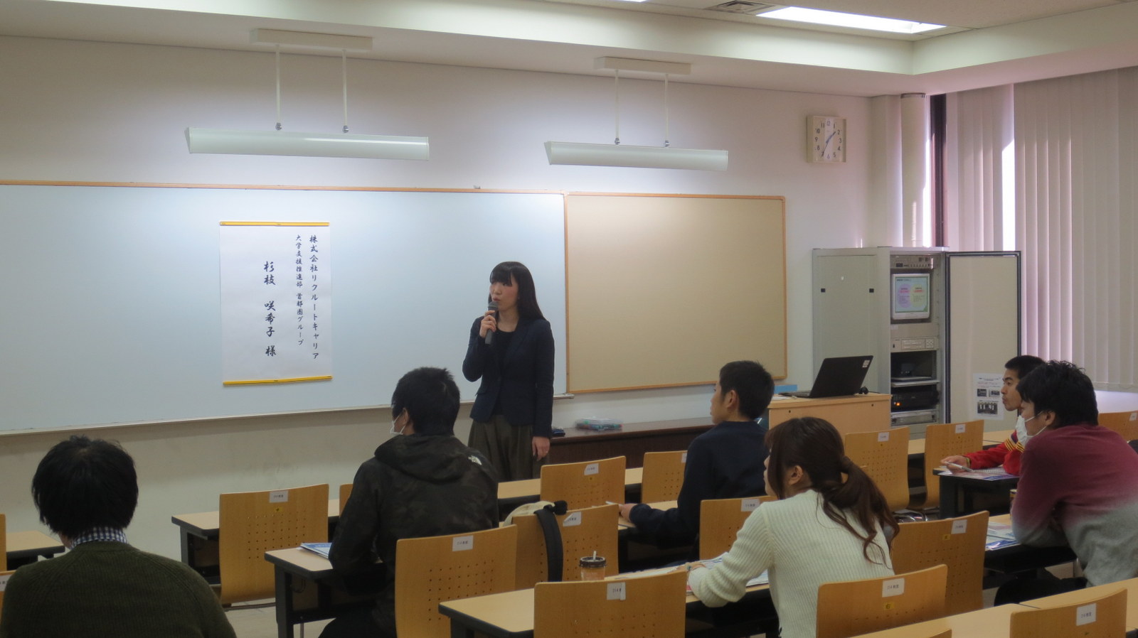 杉枝氏は、本日のガイダンスの目的である自分に合った就職先を探す方法についてお話しされ、SPI検査(体験)や企業理解を深めるワークショップ、実際の就職活動の一連の流れについて、今後のスケジュールを示しながら具体的にご説明いただきました。参加した学生達は熱心に傾聴し、夢を叶えるためには今何をしたらよいかということを真剣に考える機会となりました。ガイダンス終了後、杉咲氏のもとへ質問に来た学生もおり、就職活動を控えた学生にとって大変有意義なガイダンスの時間となりました。