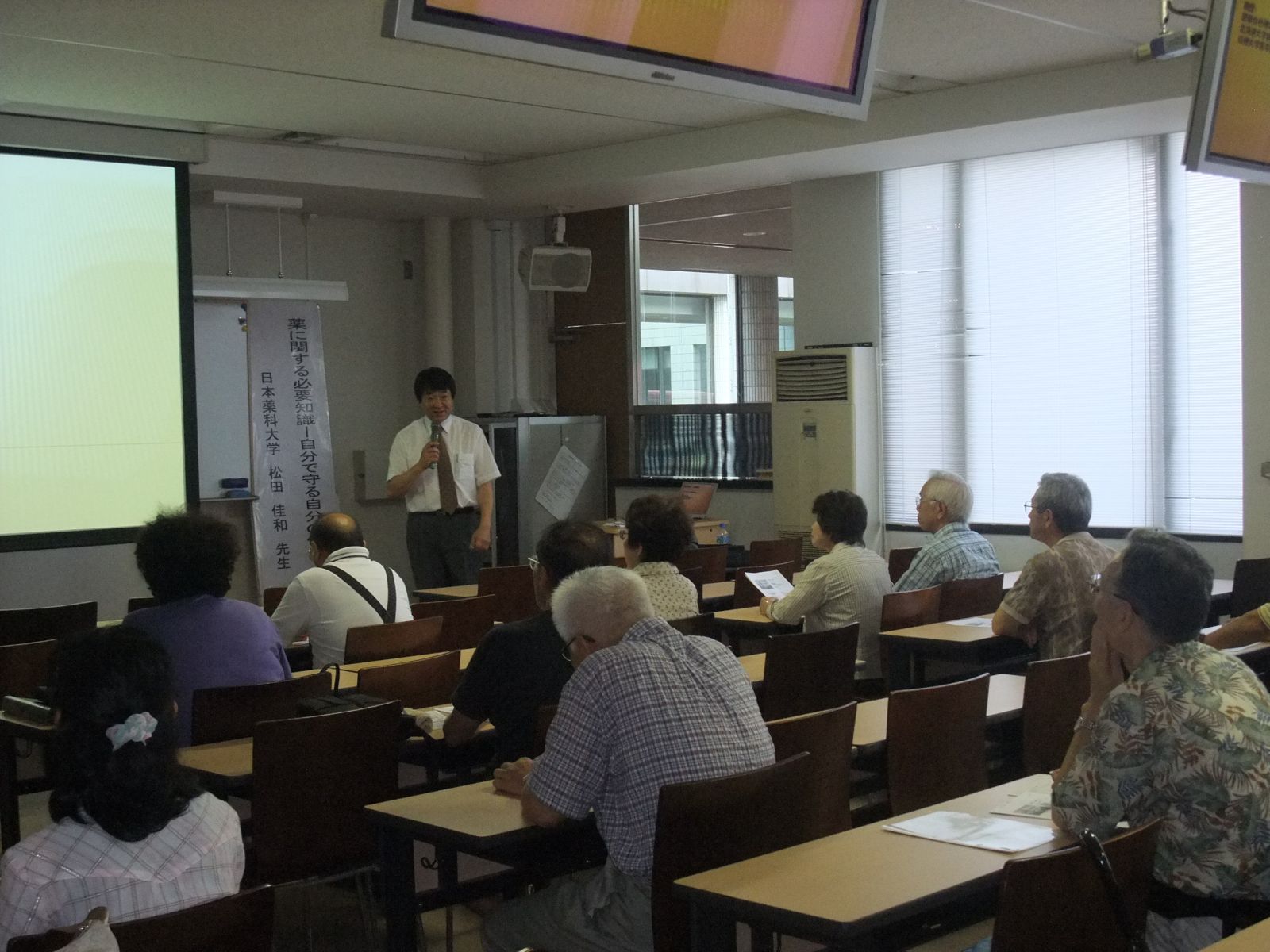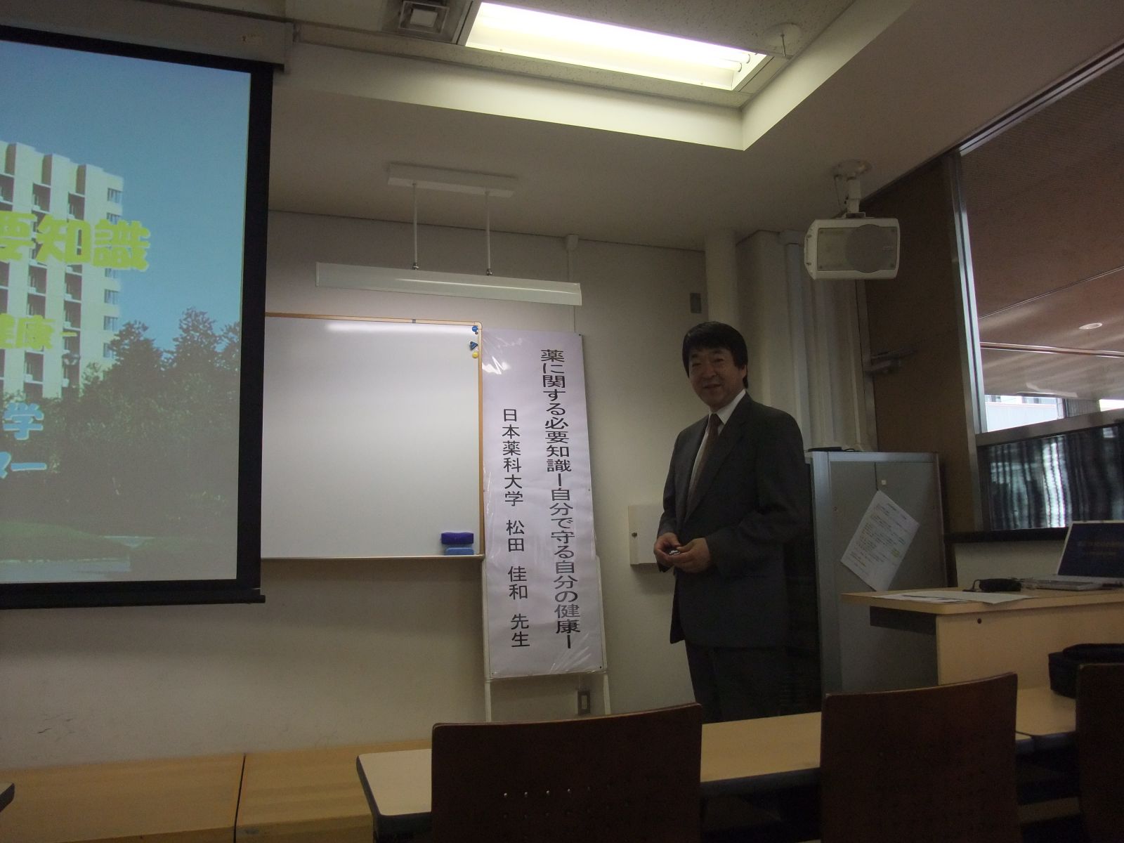 今回の講座では、臨床薬学教育センター松田佳和教授が「薬に関する基礎知識-自分で守る自分の健康-」と題して一般用医薬品、薬事法改正とその狙い等について講演しました。