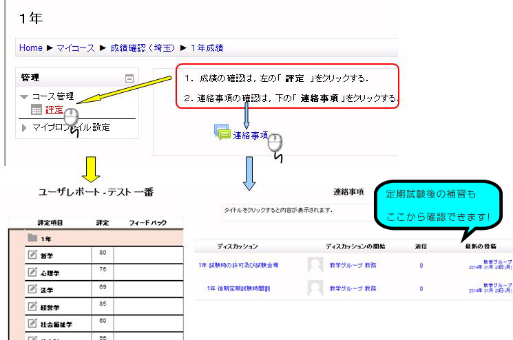 評定(成績)又は連絡事項の確認を行うことができます。 ※定期試験後の補習もここから確認できます! |